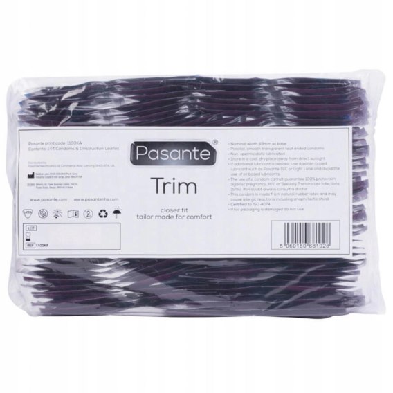 Pasante Trim to węższe prezerwatywy, stworzone z myślą o osobach preferujących ciasniejsze dopasowanie i większy komfort. Z nominalną szerokością 49 mm zapewniają bezpieczne, komfortowe użytkowanie. Gładkie, przezroczyste i zakończone zbiorniczkiem.